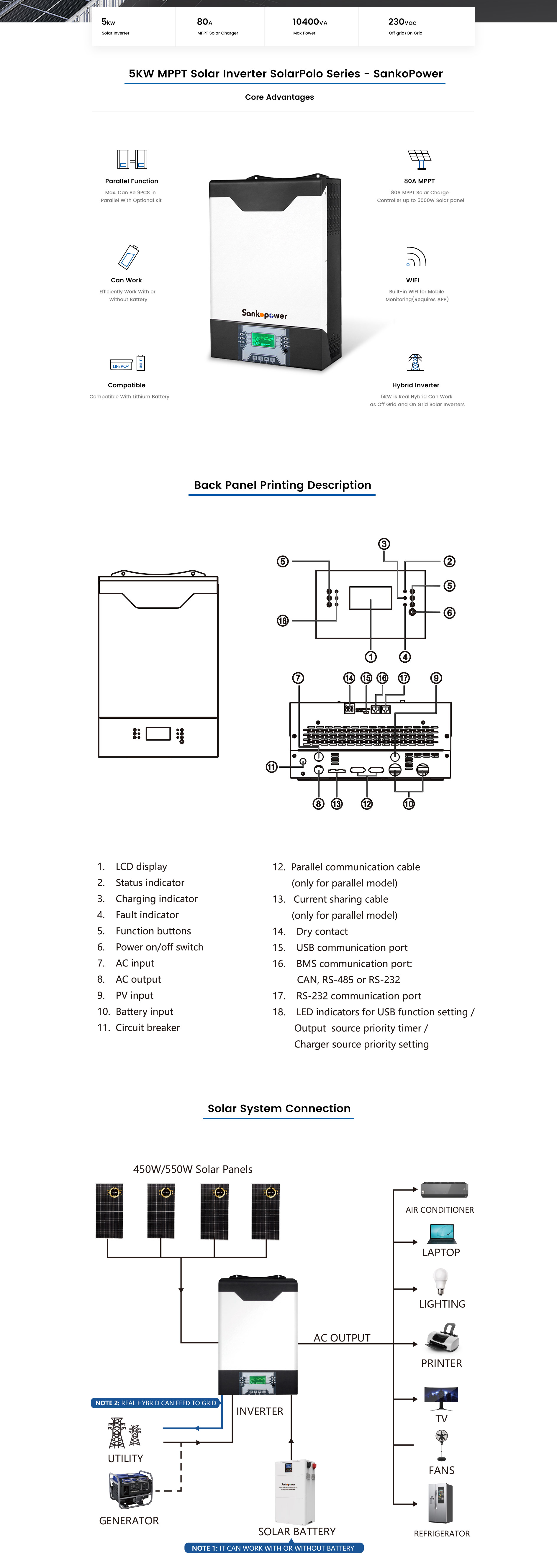 NOTE 2: 5KW Hybrid MPPT Solar Inverter SolarPolo Series supports the WIFI function, and have Built-in WIFI (Requires APP)
