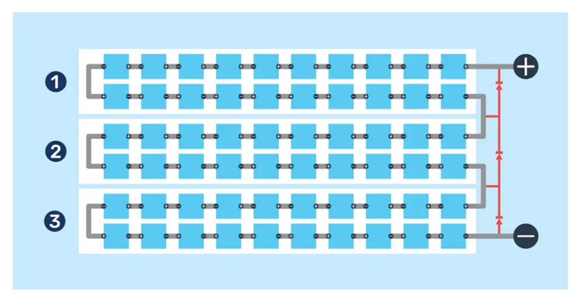 With the traditional full cell string series wiring, shown above, if a solar cell in Row 1 does not have ample sunlight, every cell within that series will not produce energy. This knocks out a third of the panel.