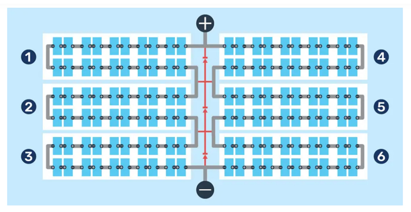 If a solar cell in Row 1 is shaded, the cells within that row (and that row only) will stop producing power. Row 4 will continue to produce power, generating more energy than a traditional series wiring because only one-sixth of the panel has stopped producing power, instead of one-third.
