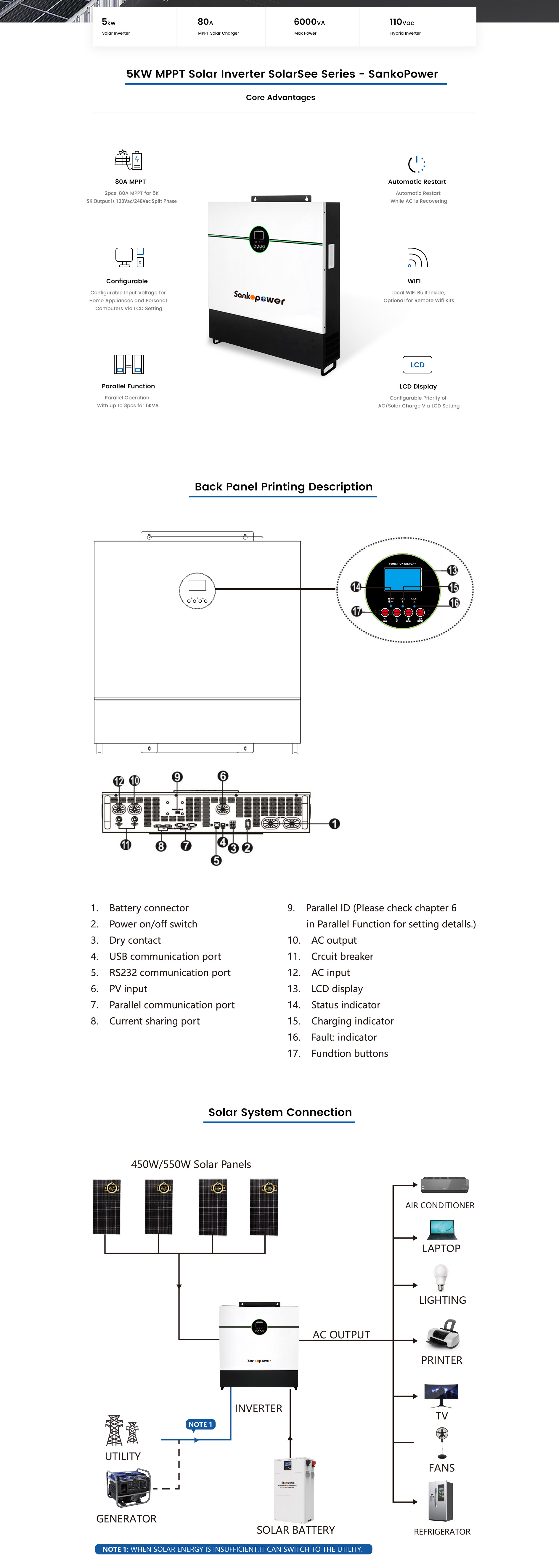 NOTE 1: 5000W MPPT Solar Inverter SolarSee Series supports the WIFI function, and have Built-in WIFI (Requires APP)
